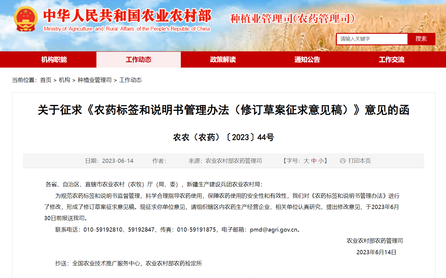 6月14日,農業農村部發布關於征求《農藥標簽和說明書管理辦法(修訂草案征求意見稿)》意見的函。為規範農藥標簽和說明書監督管理,科學合理指導農藥使用,保障農藥使用的安全性和有效性,農業農村部農藥管理司對《農藥標簽和說明書管理辦法》進行了修改,形成了修訂草案征求意見稿。現征求各單位意見,請組織轄區內農藥生產經營企業、相關單位認真研究,提出修改意見,於2023年6月30日前報送。